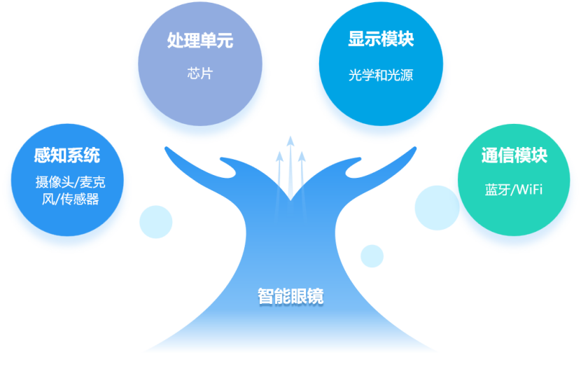 智能眼镜囊括了带有独立数据处理芯片且不具备显示功能的智能眼镜形态产品,主要组成部分有感知系统、处理单元、显示模块及通信模块。