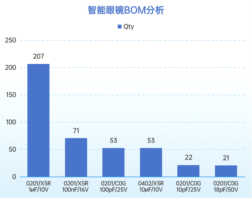 据智能眼镜BOM表显示,在智能眼镜电路设计中,对小尺寸、不同容值电压特性的电容需求多样,且用量随功能场景不同有明显差异,其中0201封装用量占比最大。