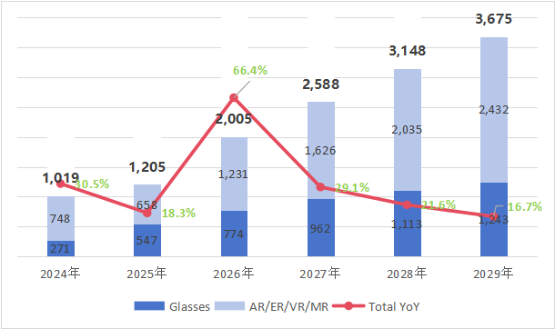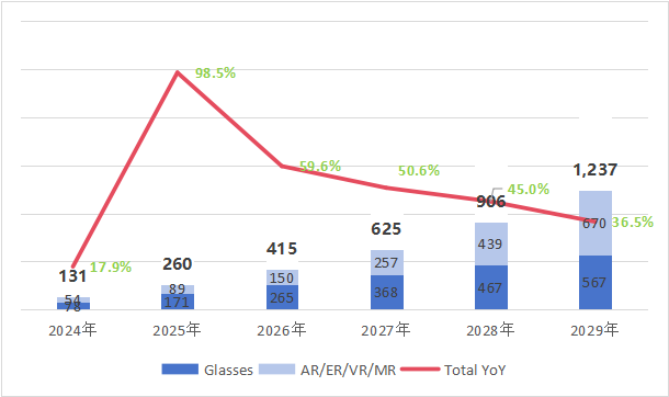 近年来全球市场智能眼镜的出货量暴增,AR/ER/VR/MR 眼镜的出货量占比较大,且增长速度较快,在2024年出货量就已达到748万台,据IDC预测,至2029年该类眼镜的全球出货量将会到达2432万台,同比增长16.7%。