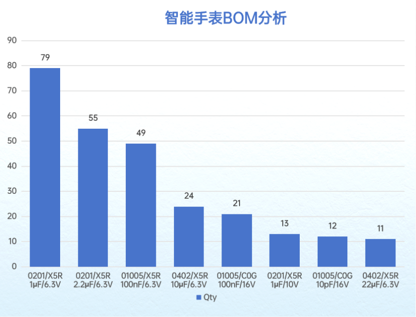 据BOM表来看,在智能手表中的MLCC主要涵盖01005-0402小尺寸封装,以X5R材质为主,容值覆盖pF到μF级,其中用量 Top3 为: