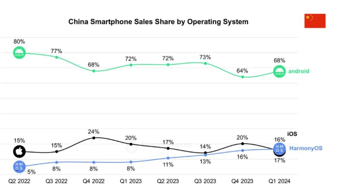 6月13日,国际调研公司Counterpoint Research的数据显示,华为HarmonyOS操作系统在中国市场取得了一个重要的里程碑。2024年第一季度,HarmonyOS首次超越苹果iOS,成为中国第二大移动操作系统。HarmonyOS的增长并不局限于中国。在全球范围内,其市场份额同比翻了一番,在 2024 年第一季度达到4%。