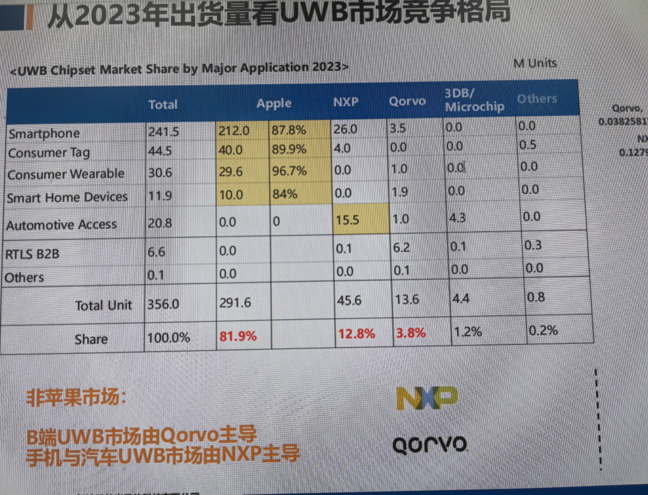 目前,B端UWB市场由Qorvo主导,手机与汽车UWB市场由NXP主导。具体来看,NXP在智能手机领域以及汽车领域这两大领域的出货量较大,在2023年获得了12.8%的市场份额,其中Tag也贡献了一定的出货量。Qorvo的产品则主要聚焦在智能手机市场,智能穿戴、智能家居设备也有一定的出货量,让其获得了总计3.8%的市场份额。3db Access AG/Microchip则主要面向汽车领域,也有了1.2%的市场份额。