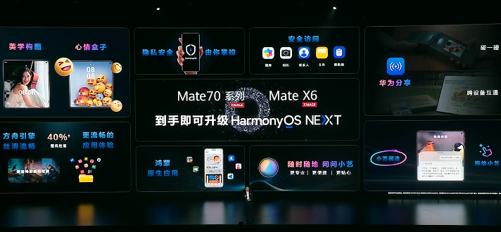 在发布会上,余承东表示“我们预计两三个月后,我们的鸿蒙原生生态的应用体验将会更加成熟更加完善,将会为大家带来更流畅、更安全、更智能的原生鸿蒙体验。”余承东表示,华为Mate 70系列和华为Mate x6系列将提供鸿蒙4.3和原生鸿蒙5.0两个选择,明年推出的华为手机、平板将全部搭载原生鸿蒙。