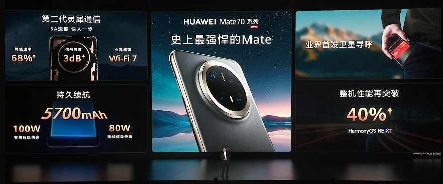 在充电技术上,相比Mate 60系列,Mate70系列10分钟充入电量提升11%。