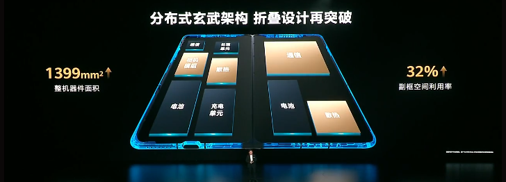 余承东表示,Mate X6采用分布式玄武架构,更大空间更强性能。其中整机器件面积提升1399mm²,副框空间利用率提升32%。同时,分布式结构实现了热源分离,具备超强散热性能。Mate X6的分布式射频单元,有更大灵犀天线,信号更强,其中天线长度增加81%,信号强度提升60%。