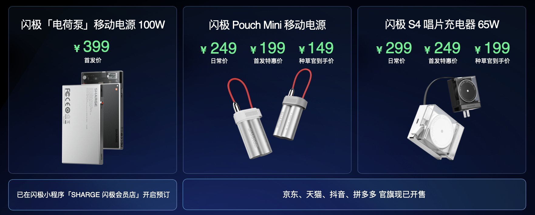 除重磅发布闪极AI「拍拍镜」之外,发布会现场闪极还带来了三款在技术、颜值和性能方面极富竞争力的充电产品,分别为闪极电荷泵移动电源100W、闪极Pouch Mini移动电源、闪极 S4 唱片充电器65W。