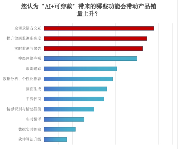 其中,针对AI技术在可穿戴设备上的应用,根据电子发烧友网的调研数据,全场景语音交互、健康监测准确度提升以及实时监测与警告被认为是最能带动产品销量提升的三大功能。