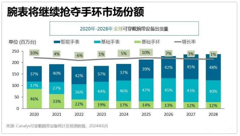 Canalys研究分析师Jack Leathem指出:“在全球范围内,基础手表的受欢迎程度居高不下。2024年第一季度,其在可穿戴腕带设备市场的份额达到了有史以来的最高水平,占到了48%。预计全年出货量份额将达到46%。”这一数据充分证明了基础手表在市场上的强大竞争力。