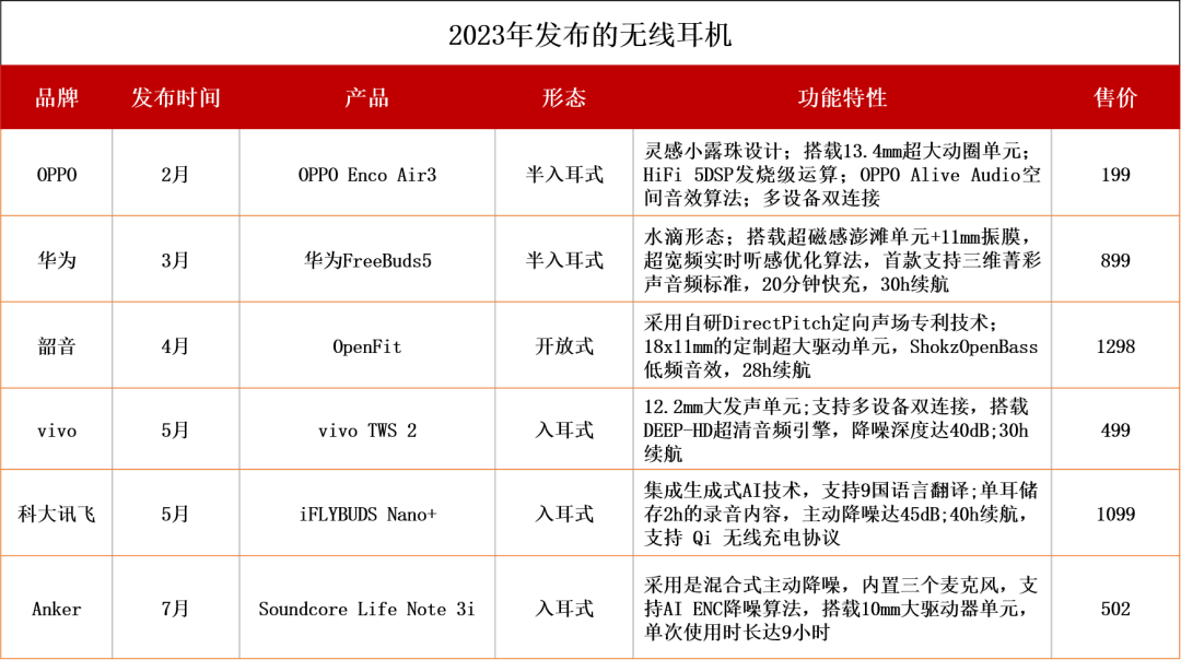 图:2023年上半年发布的部分无线耳机