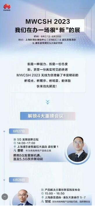 在MWCSH2023期间,华为将带来4大重磅会议。一、6月27日召开5G发展创新论坛;二、6月28日华为产品解决方案创新实践发布会,华为无线网络产品线副总裁、首席营销官甘斌将带来5GigaGreen使能全频段走向5G的发布。三、6月30日,华为无线网络5.5G领域总裁将带来面向5.5G的网络演讲。此外在6月27日和6月30日分别安排了两场媒体圆桌。