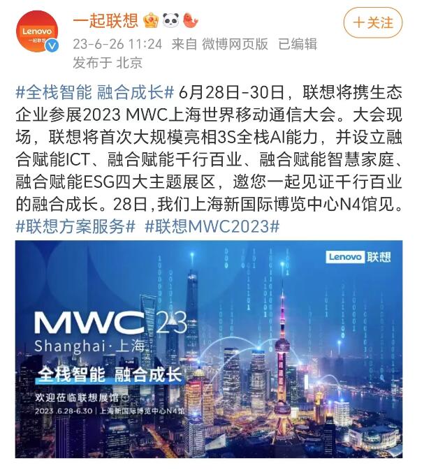 联想官方微博显示,6月28日到30日,联想将携生态企业参展2023MWC上海世界移动通信大会。大会现场,联想将首次大规模亮相3S全栈AI能力,并且设立融合赋能ICT、融合赋能千行百业、融合赋能智慧家庭、融合赋能ESG四大主题展区。联想展台在上海新国际博览中心N4馆。