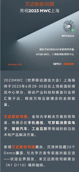 全球光学解决方案的领导者艾迈斯,在官方微信展示了2023MWC上海场的活动公告,公告显示,这家公司将在此次展会上展示手机通信、可穿戴消费类电子、智能汽车、工业互联等领域的前沿技术和产品解决方案。