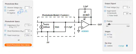设计精密光电感应电路的标准方法是,跨运算放大器的 CMOS 或 FET 晶体管输入端放置一个光电二极管 (D1),并在反馈回路中与电容器并联放置一个电阻器。该电路使用 Analog Devices 的 光电电路设计向导进行建模(图 1)。为捕获红色光和红外光,使用了 OSRAM Opto Semiconductors 的 SFH 2701 光电二极管,该二极管的光学范围为 400 纳米 (nm) 至 1050 nm。