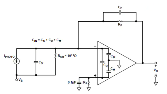 稳定性分析中需要考虑三个电路设计变量:光电二极管、放大器以及并联的 RF 和 CF (RF||CF) 放大器反馈网络。光电二极管的选择取决于其光响应特性,然而,其寄生电容 (CS) 对电路的噪声增益和稳定性有很大影响。