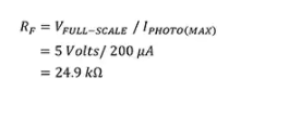 该电路的设计准则是 5 伏满量程输出及 200 μA 的最大光电二极管电流。根据等式 2,可利用满量程输出电压和最大光电二极管电流确定反馈电阻的值: