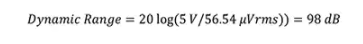 前置放大器的总输出动态范围(以分贝为单位)的计算方式为:将满量程输出信号(5 伏)除以总输出均方根噪声 (56.54 μVRMS),取 log10 对数,然后乘以 20,参见等式 10: