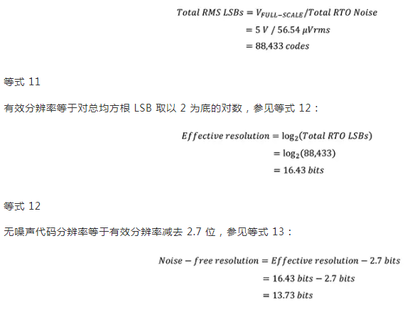 有效分辨率等于转换为有效分辨率的最大位数,而最大位数(或总代码数)等于满量程输出除以总输出噪声,参见等式 11: