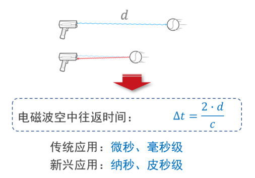 受到庞大需求场景的鼓舞,顾教授着手带领团队研发面向广泛日常生活场景的智能感知雷达技术,例如手势交互、封闭空间监测、人体姿态识别、生命体征探测等。顾教授分析,这些新兴的智能感知场景多是<10米的近距目标探测,有些场景甚至是小于1米的极近距离,电磁波在空中往返时间极短,如下图所示。
