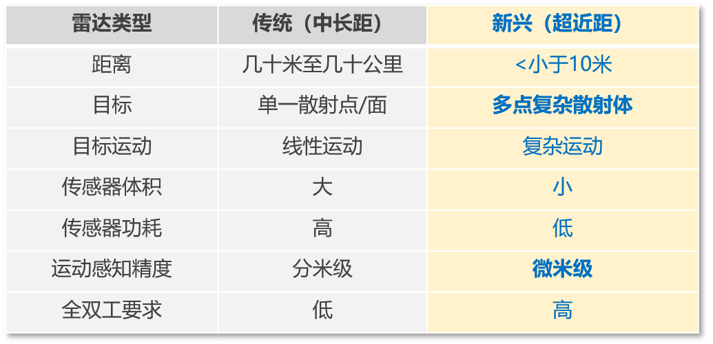 顾教授指出,在新兴的智能感知领域,目前还没有比较好的芯片级解决方案,多数芯片还是沿用了车载雷达的架构和算法体系,在实际应用中存在诸多瓶颈。车载毫米波雷达技术在硬件系统架构、算法流程等方面更适合中长距离探测;另外,车载与生活场景对应的电磁波散射、目标运动等物理特性存在本质差别,这使得基于汽车雷达的毫米波感知技术方案若要用在日常生活中的智能硬件,仍然存在近距盲区、识别精度不足、功耗大等天然缺点,因而使得车载方案不能满足智能家居、穿戴等新兴领域对毫米波雷达体积、功耗、精度等的要求,应用维度受限。
