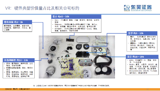 从VR/AR产业链来看,上游元器件包括光学与显示模块(光学镜片、显示屏、摄像头等),计算模块(芯片等),声学模块(扬声器等),交互模块(传感器等)等。从Quest2的拆解图可以看到,芯片和显示光学模块是VR设备中作为重要的硬件,芯片在终端设备中占比接近50%,其次是显示模块,包括LCD、OLED的占比达到20%——25%,镜片以及摄像头等光学模块占比也达到了6%——10%。
