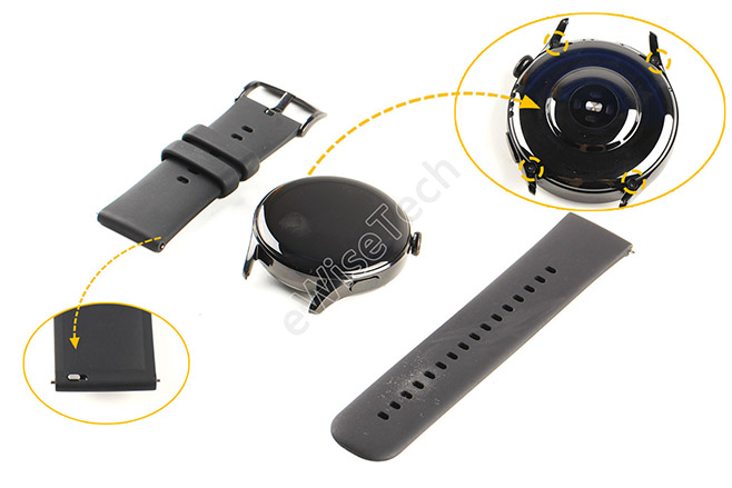 WATCH 3表带背面有弹力卡扣设计,细节处理很好,方便更换表带。手表背面有四颗固定螺丝,拆解便从这里开始。
