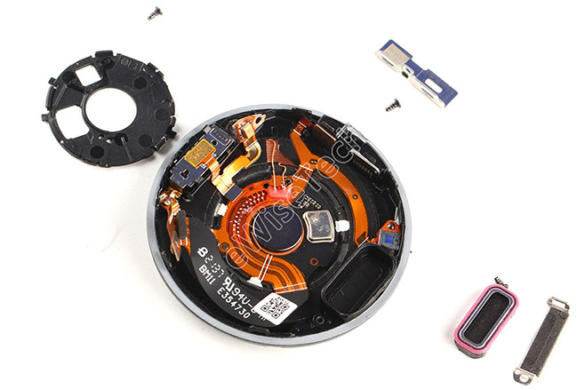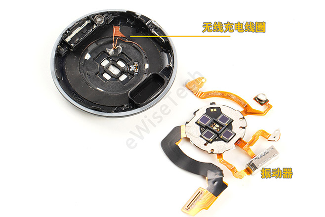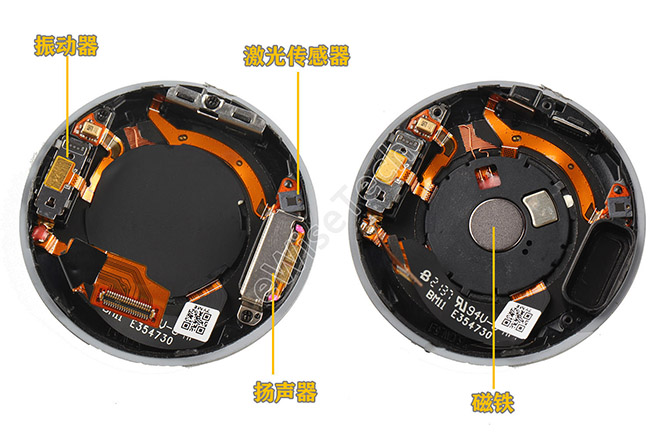 在后盖上可以看到振动器和扬声器分别位于两侧,右上角位置有一个激光对焦传感器,用于感应表冠旋转的指令。后盖上面黑色塑料纸撕下,可以看到中间是一个磁铁。