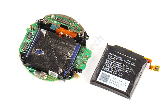 华为WATCH 3整体使用14颗螺丝以及双面胶两种方式进行固定,还使用了四个定位器,分别用于固定BTB连接器、扬声器和气压传感器。后盖和整机除了螺丝以外还采用了黑色胶圈用于防水防尘。由于手表是5ATM防护等级,所以在多处可以看到防水胶圈或者防水标签。