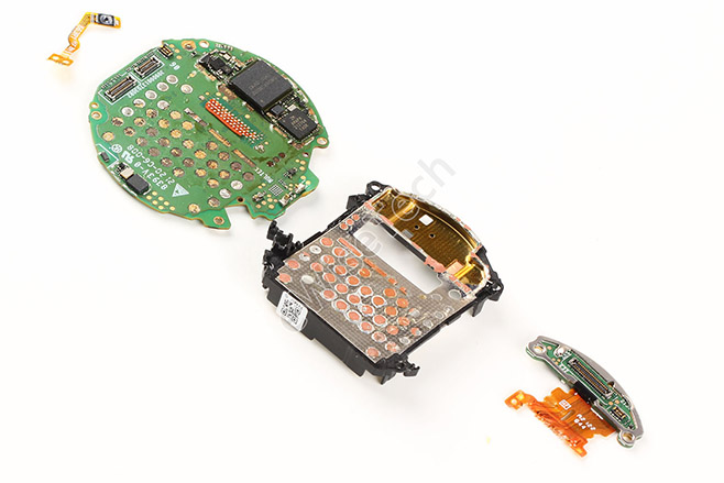 后盖拆解完成,再继续回到手表上方模块。先取下左侧BTB定位器,断开屏幕BTB接口;再拧下四周螺丝,取下主板、电池以及按键板。表冠按钮的按键软板上面有红色硅胶保护垫。