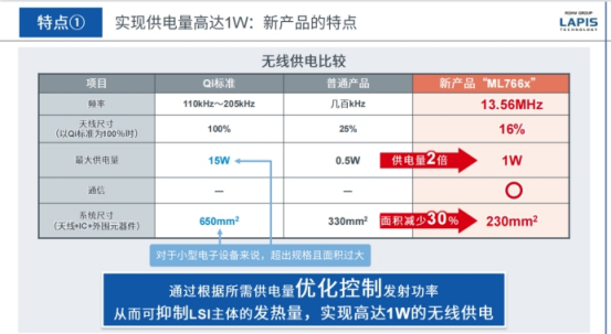 可以看到,以Qi标准进行无线供电的产品的使用频率是110KHz到205KHz,最大供电量是15W。相对应的系统尺寸包括天线、外围元器件的尺寸达到了650平方毫米。普通尺寸最大供电量是0.5W,系统尺寸是Qi的一半---330平方毫米。ML766x目前能够达到普通产品供电量的两倍。据介绍,1W供电对应的芯片发热是通过优化控制发射功率来抑制LSI的发热,实现了1W的无线供电。