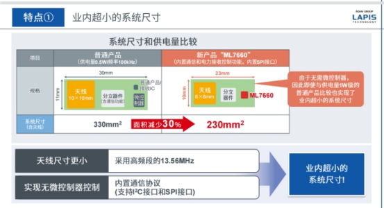 如何使系统尺寸比普通产品减少30%?可以看到普通产品系统构成主要有天线、分离元器件以及微控制构成。通过两个方式把系统尺寸总体减少,一个是减小了天线,第二个是系统无微控制器实现通信。