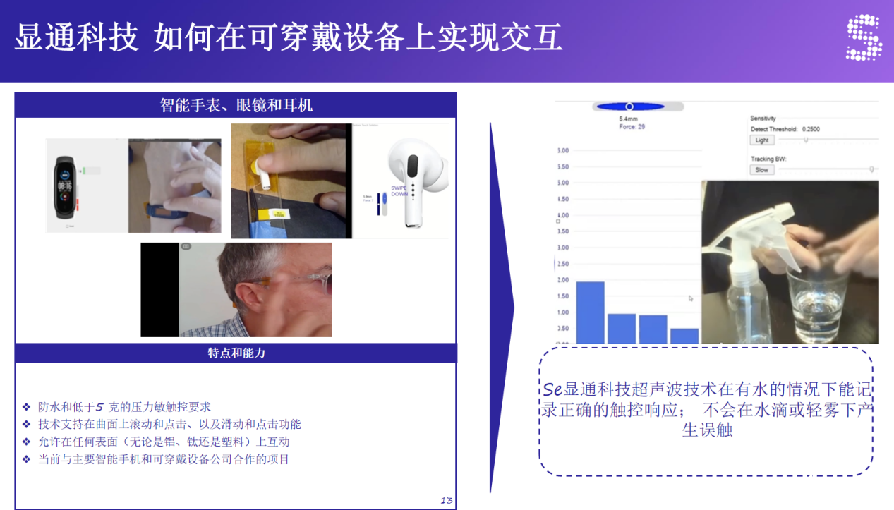 可穿戴设备的特点表现为小巧、在一些场景会受到汗水、雨水等影响,因此对防水和防误触有痛点需求。而显通科技的触控技术既有触控能力也可以很好的防水,可应用于智能手表、智能眼镜、TWS耳机等。
