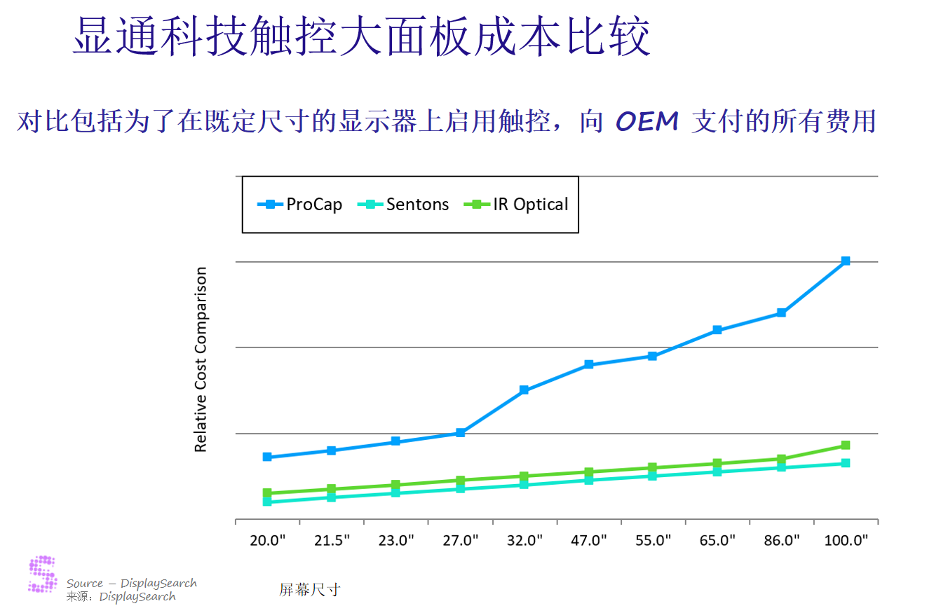 第一,电容触控屏的成本随着尺寸增大而增加,也就是和显示器的对角线长度的平方相关,尺寸变成两倍时它的成本会变成2的平方即四倍,它的成本是以这样的速度上升。而超声波触控只是在屏幕的周围周长边上追加传感器,传感器的数量在一定的尺寸范围之内,甚至是不变的,所以超声波触控的成本和屏幕尺寸的大小的相关性没有那么大,成本优势更加明显。