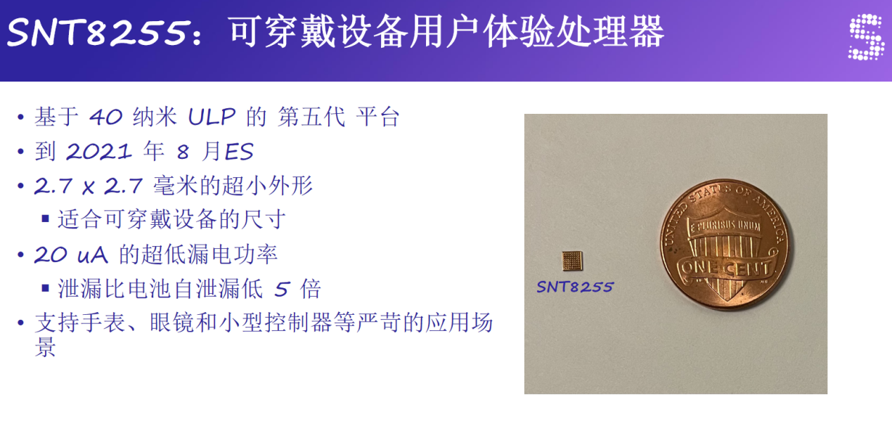 SNT8255具有小型化和低功耗的特性,尺寸仅2.7X2.7毫米,最低电流可以到20微安,可以适用于不同的穿戴类产品。这款芯片和在手机上使用的同类芯片相比,功耗整整下降5倍。