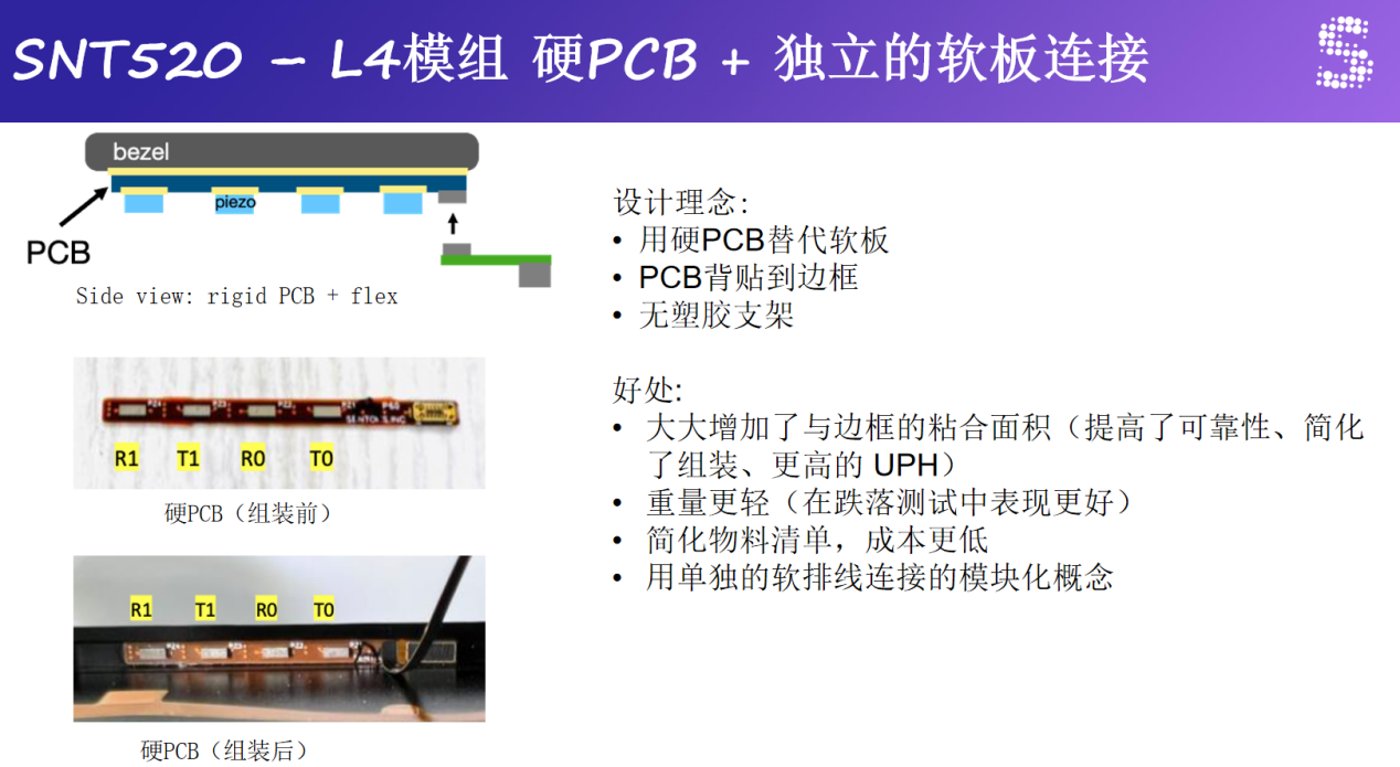 进一步来看,通过这个模组组装技术,不需要在传感器的表面涂抹胶水,贴到所需要的触碰界面上。而是用PCB背面,通过粘合剂贴到所需要的表面,这样整体的粘合面积就比原来的传感器的贴合要大得多,可靠性会更高,性能也会更好。同时采用这种方式,减少了部件数量。过去必须有相应的组装支架放在软板后面,现在可以把支架去掉,整体结构更简单。还可以视触控的长短,选用一个PCB,或两个PCB直接连接,模块化设计给客户带来便利。