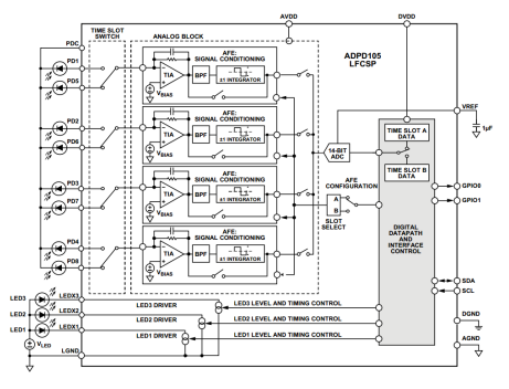 基于光电式的心率监测方案(也称光电容积脉搏波描记法PPG),硬件上需要有光源驱动、光电转换、模数转换数据处理等模块。一般光源驱动我们选择恒流源(需要可以微调电流和一定的频率开关);光电转换选择光电二极管然后用运放进行流压转换和信号调理;最后用A/D芯片实现模拟量的数字转换并送至MCU进行处理。硬件方案如果采用分立器件,那么芯片数量较多,并且空间受限,所以最好还是采用集成器件。ADI公司拥有多功能光电式测量前端芯片(型号:ADPD105),完全集成式AFE、ADC、LED 驱动器和时序内核, 提供一流的环境光抑制性能,无需光电二极管滤光器;灵活的数字接口SPI、I2C 可供选择;功耗低,1.8 V模拟/数字超低工作电源,待机模式仅0.3μA电流,适合电池供电的设备;灵活的采样频率范围:0.122 Hz ~3820 Hz;多达3个LED恒流源,每通道峰值电流达370mA;拥有WLCSP芯片级封装,极致的小体积适合空间受限应用。其内部功能框图如图1。