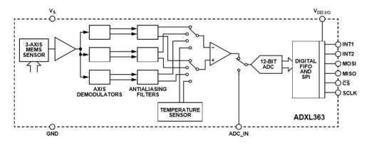 计步方案使用最多的就是三轴加速度传感器,通过算法识别行走时的三轴动态数据,即可实现计步功能。本方案是基于可穿戴设备,因此芯片的功耗、体积成为重要考虑因素。ADXL363是一款超低功耗的3个传感器组合产品,由3轴MEMS加速度计、温度传感器和用于同步转换外部信号的ADC输入端组成。整个系统输出数据速率为100 Hz时功耗低于2µA,在运动触发唤醒模式下功耗为270 nA;1.6~3.5V工作电源范围,便捷的兼容其他器件的电源;ADXL363还提供针对内部ADC的访问,可同步转换外部的模拟输入。紧凑型的LGA封装非常符合可穿戴式设备应用。其内部功能框图如图2。