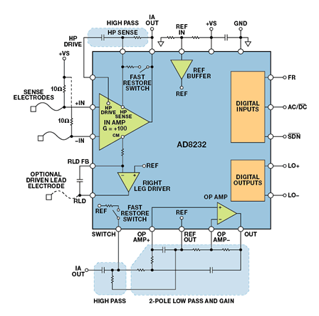 AD8232内置增益为100V/V的仪表放大器和一个高通滤波器,能阻止皮肤上电极的半电池电位产生的失调电压。输出缓冲器和低通滤波器则可抑制肌肉活动产生的高频分量(EMG信号)。此低功耗前端功耗为170μA,还可与ADI另一款16位片上计量仪ADuCM350配合使用,进行高性能、单导联ECG测量。