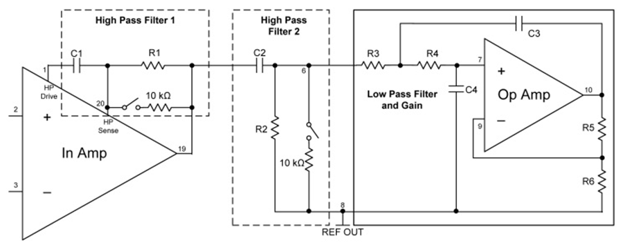 第一个滤波器的–3dB截止频率为FHP1−3dB=100/(2πR1C1)。由于放大器的增益和反馈架构,滤波器截止频率比一般预计值高100倍。上图显示了实现最优信号传输的放大器和各种滤波器级电路图。