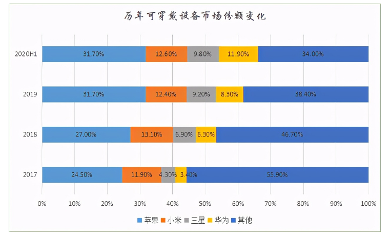 2020年上半年,从全球市场厂商排名上看,苹果以31.7%的市场份额遥遥领先,苹果出货量5060万台,全球出货量第一。排名第二的则是小米,出货2020万部,市占为12.6%。华为排名第三,出货1900万部,市场份额为11.9%。其中苹果地位仍然不可动摇,然而华为表现最为显眼,这主要是其凭借运动手表GT2和真无线耳机Freebuds3获得的市场份额加持。