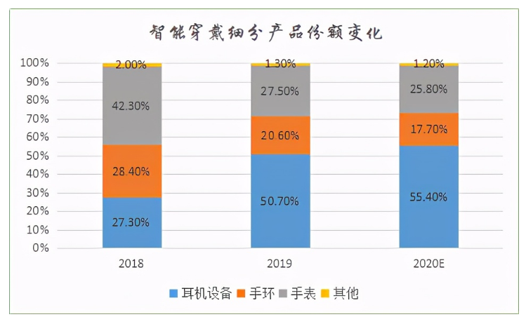 从可穿戴设备产品结构来看,2018-2019年,耳戴设备市场份额大幅上升,2019年占比突破50%,达到50.7%;手环、手表类产品份额有所下滑,2019年占比分别为20.6%和27.5%。