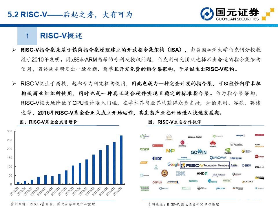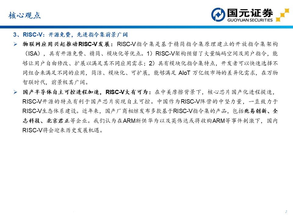 国产半导体自主可控进程加速,RISC-V大有可为:在中美摩擦背景下,核心芯片国产化进程提速,RISC-V开源的特点有利于国产芯片实现自主可控。中国作为RISC-V阵营的中坚力量,一直致力于RISC-V生态体系建设。近年来,国产厂商相继发布多款基于RISC-V指令集的产品,包括兆易创新、全志科技、北京君正等企业。我们认为在ARM断供华为以及英伟达或将收购ARM等事件刺激下,国内RISC-V将会迎来历史发展机遇。