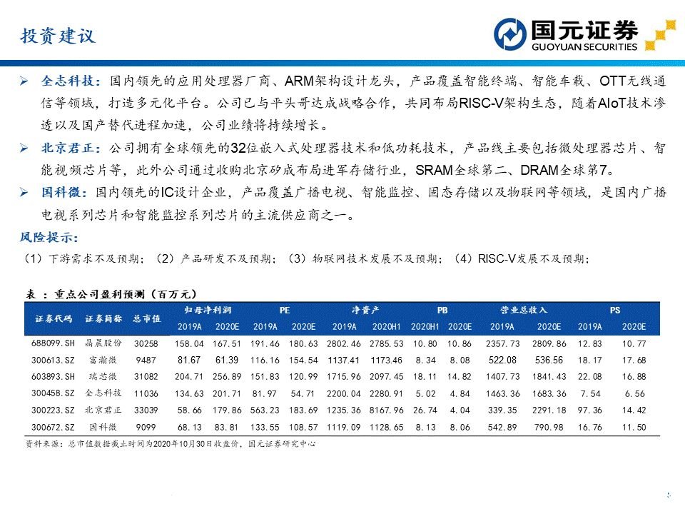 (1)下游需求不及预期;(2)产品研发不及预期;(3)物联网技术发展不及预期;(4)RISC-V发展不及预期。