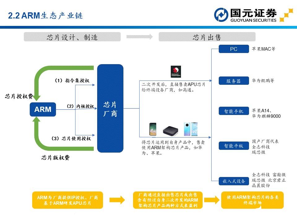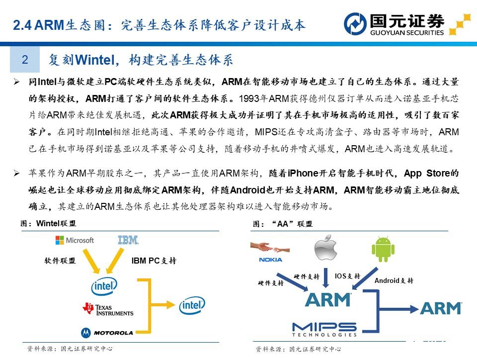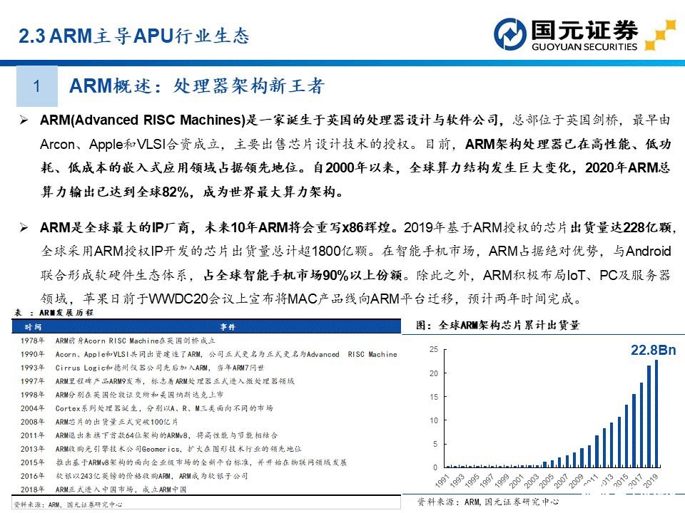 ARM是全球最具影响力的芯片IP厂商之一。ARM与Android建立的AA生态联盟战胜了Wintel联盟,成为智能手机时代的霸主,目前全球90%以上的手机APU都是基于ARM授权;