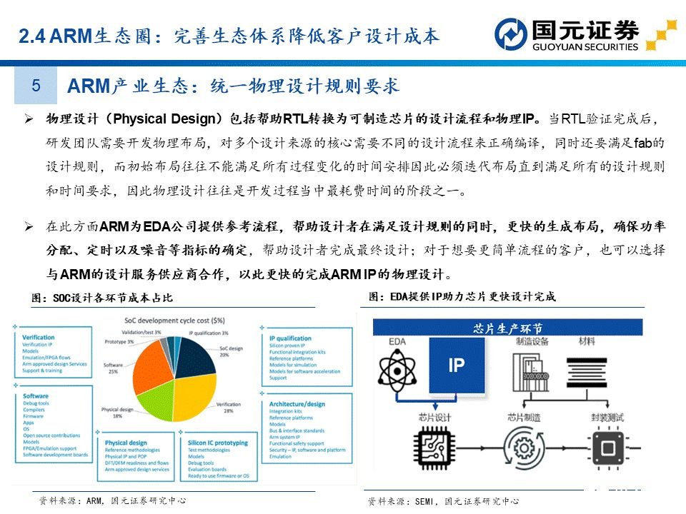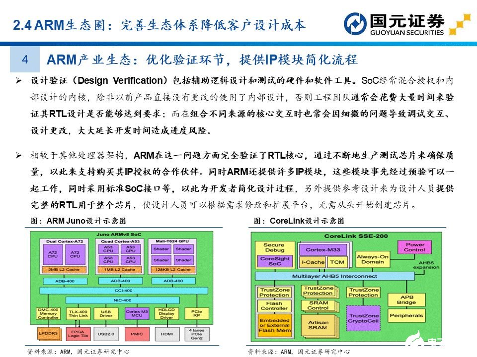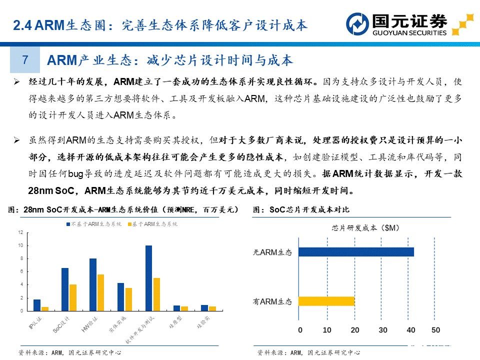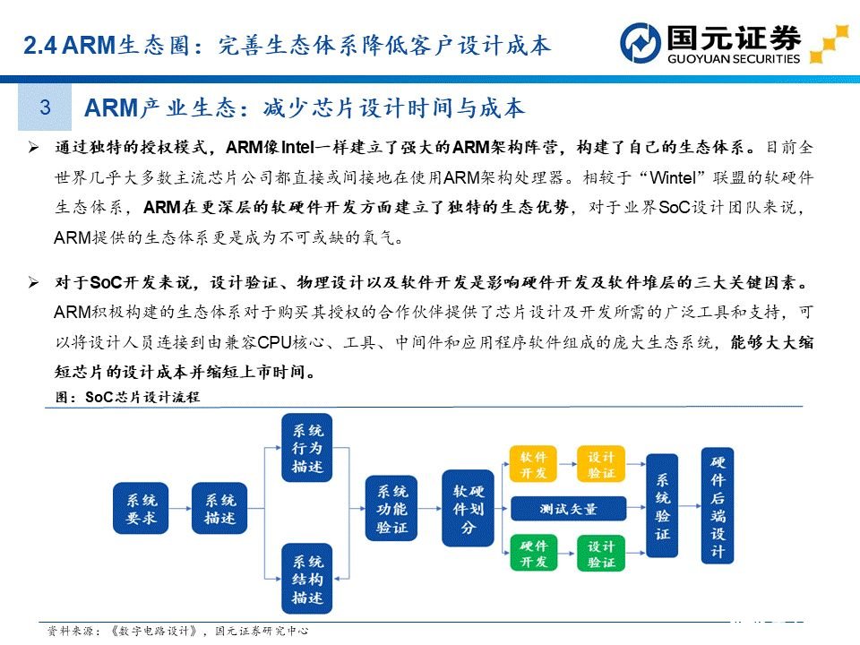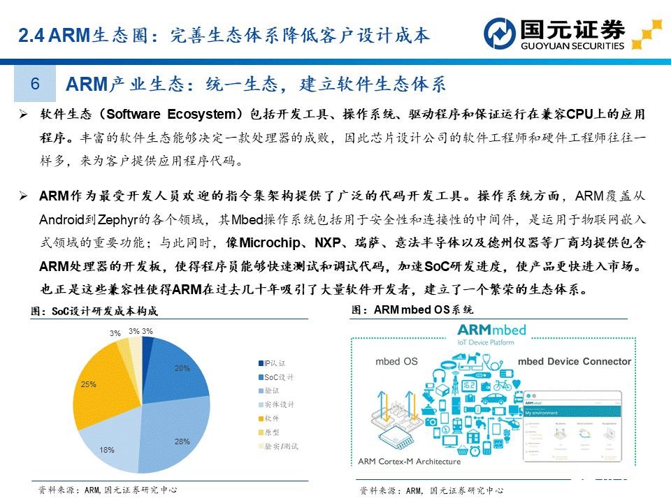ARM使用精简指令集,功耗较小、价格便宜,且拥有高并发处理效率,升级速度快等特点,十分适合物联网领域低功耗的要求,在IoT应用领域占据领先优势。2020年,ARM已成为全球算力输出的主力,基于ARM指令的处理器总算力输出达到了全球的82%,成为半导体产业的主要驱动引擎;随着5G与AIoT等技术的发展,ARM加速发展,至2020年全球基于ARM架构的芯片出货量超1600亿颗,基于ARM平台的软件越来越多,生态越来越丰富;据ARM统计,由于其成熟的生态体系,基于ARM架构授权的芯片设计厂商能够大大缩短其SoC芯片的设计时间与成本。