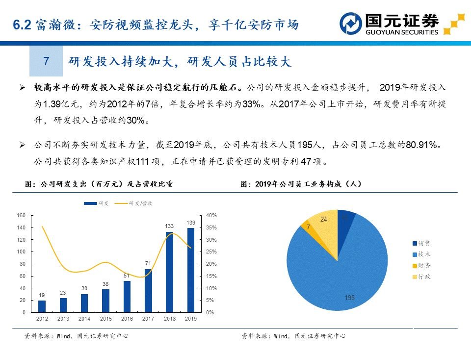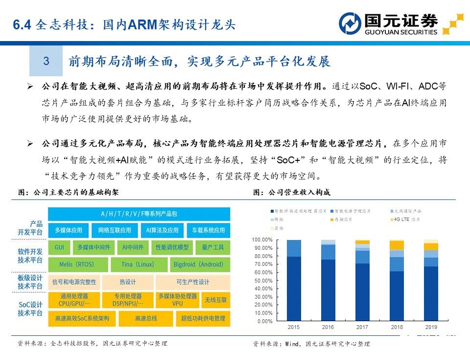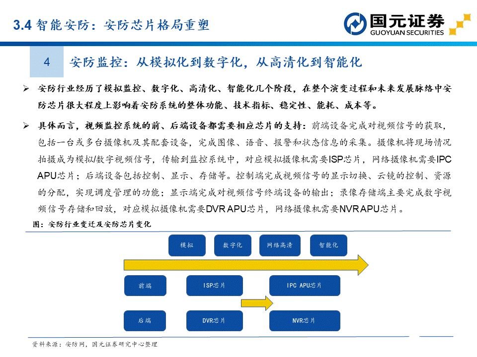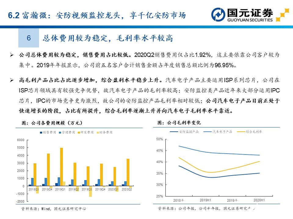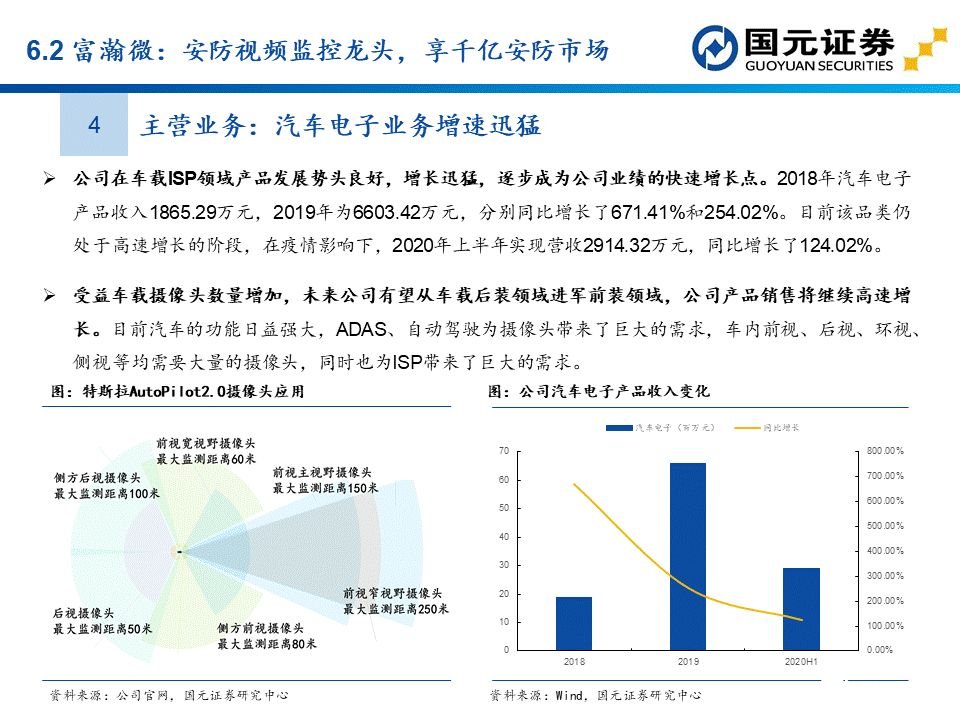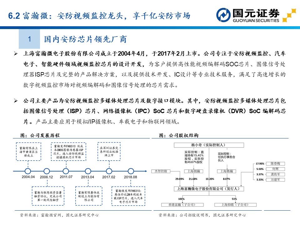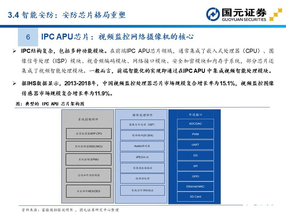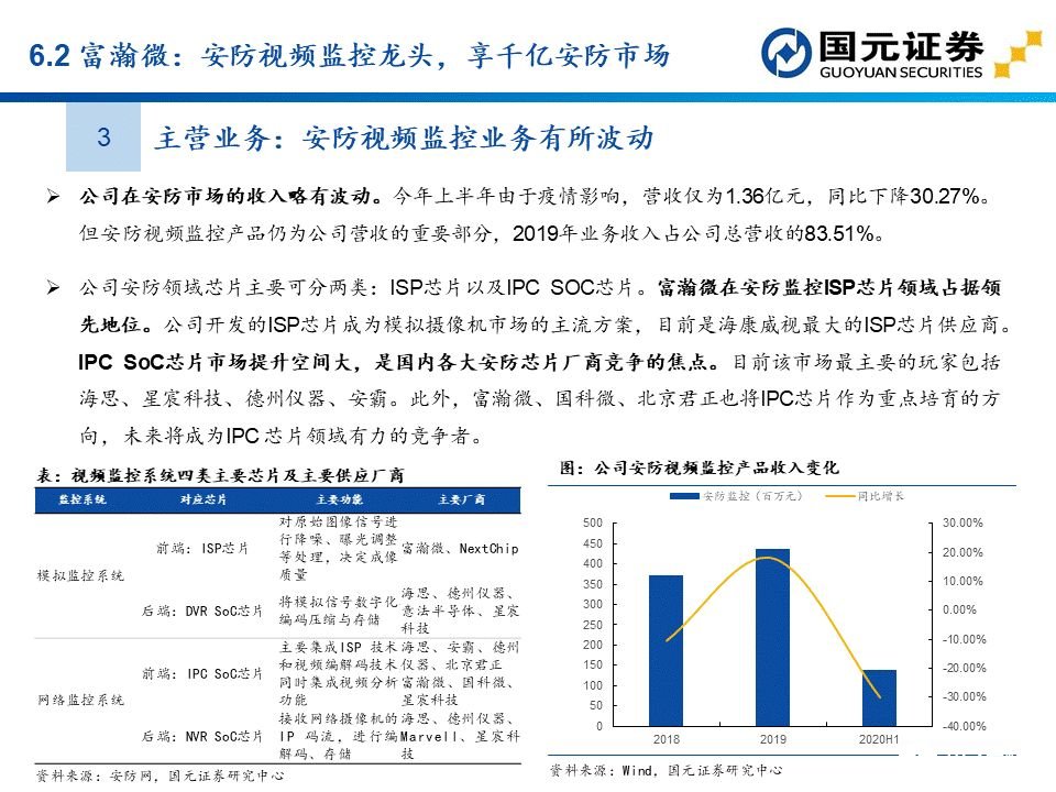 富瀚微:公司专注于泛安防领域,拥有IPC芯片、ISP芯片两大产品线组合。公司ISP芯片在泛安防及车载应用领域处于领先地位,并已经开始从车载后装市场向前装市场切入,车载市场有望为公司提供新的发展引擎。在IPC芯片领域公司是仅次于海思的第二梯队厂商,具有极强的产品竞争力。
