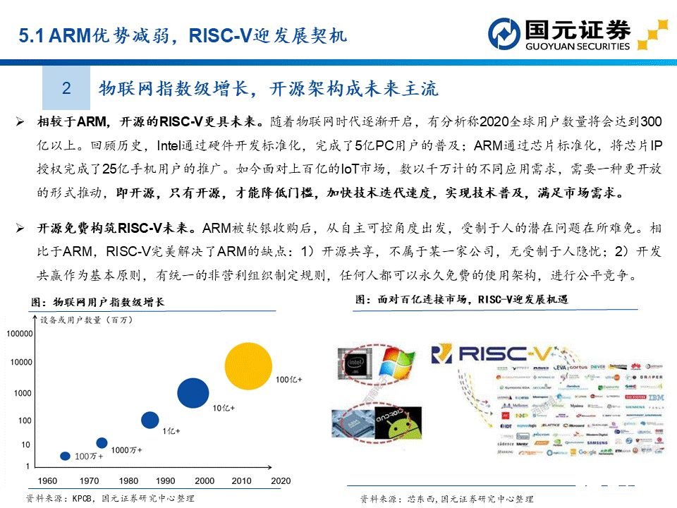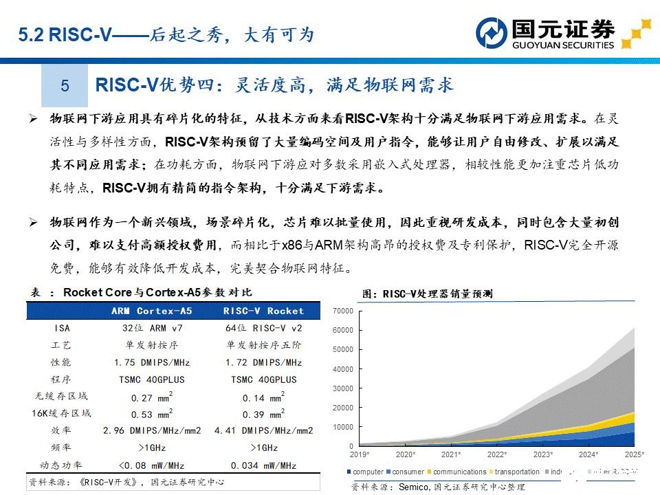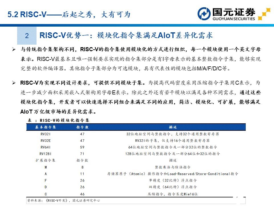 物联网应用兴起推动RISC-V发展:RISC-V指令集是基于精简指令集原理建立的开放指令集架构(ISA),具有开源免费、精简、模块化等优点。1)RISC-V架构预留了大量编码空间及用户指令,能够让用户自由修改、扩展以满足其不同应用需求;2)具有模块化指令集特点,开发者可以快速选择不同组合来满足不同的应用,简洁、模块化、可扩展,能够满足AIoT万亿级市场的差异化需求,在万物智联时代,前景极其广阔。
