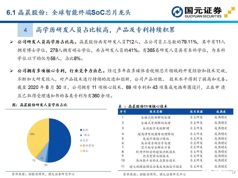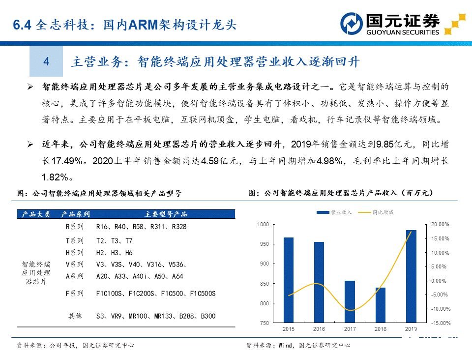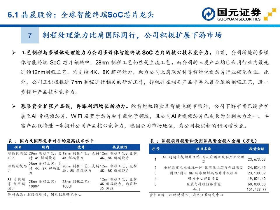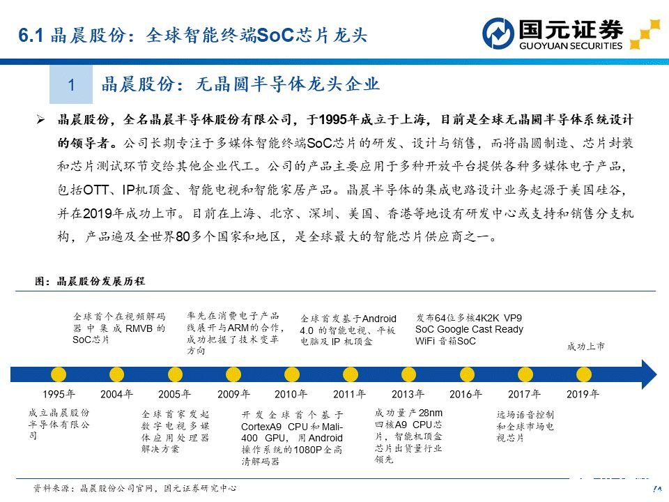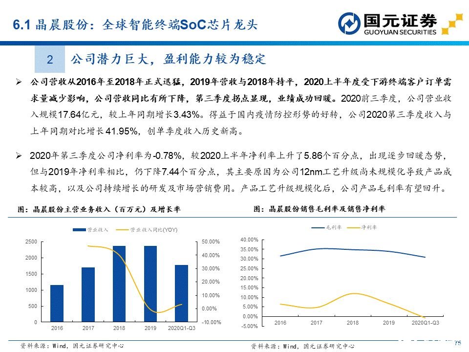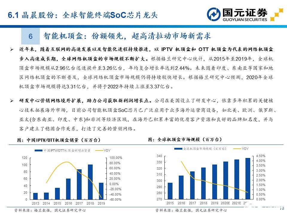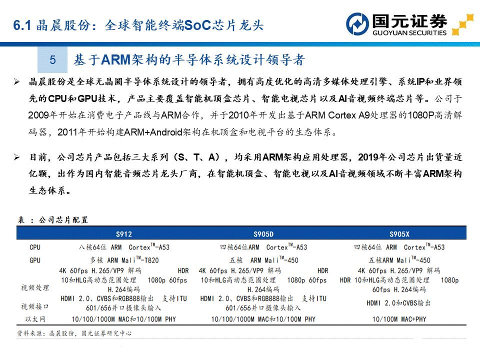 晶晨股份:全球智能终端SoC芯片龙头,产品线丰富,覆盖智能机顶盒、智能电视及AI 音视频系统终端SoC芯片、Wi-Fi和蓝牙芯片以及汽车电子芯片。在智能机顶盒SoC芯片市场,公司2019年出货量超5000万颗,超过海思成为国内第一;面向海外市场,公司推出业界领先的12nm制程芯片,获得谷歌认证,具有较强的市场竞争力。随着超高清换机、AI终端等市场的渗透,公司业绩有望持续增长。