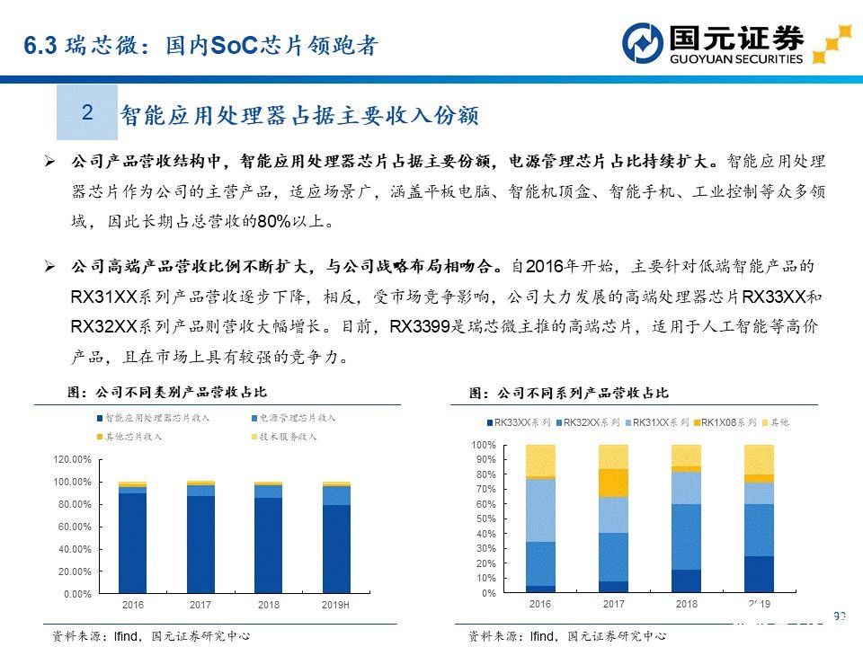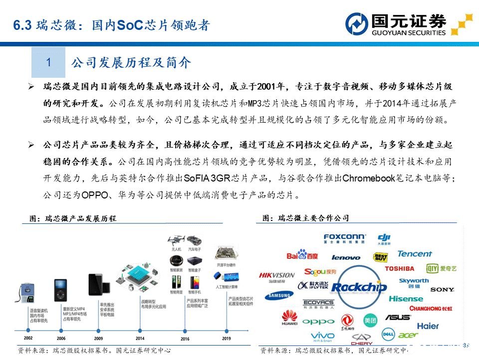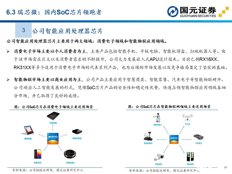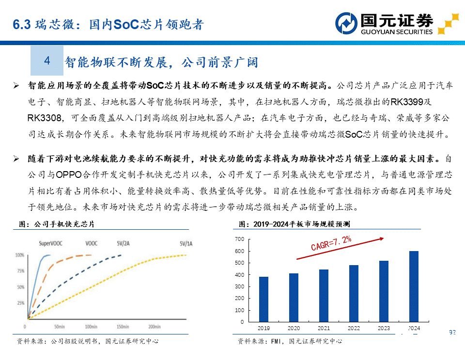 瑞芯微:国内SoC芯片领跑者,应用处理器产品覆盖消费电子和智能物联网两大领域,应用场景众多,产品多点开花。凭借行业领先的研发和技术优势,公司不断拓展新兴应用领域,建立优质客户资源包括三星、华为、海尔等。在快充芯片市场,公司与OPPO达成战略合作协议,随着手机快充成为市场主流趋势,公司未来发展值得期待。
