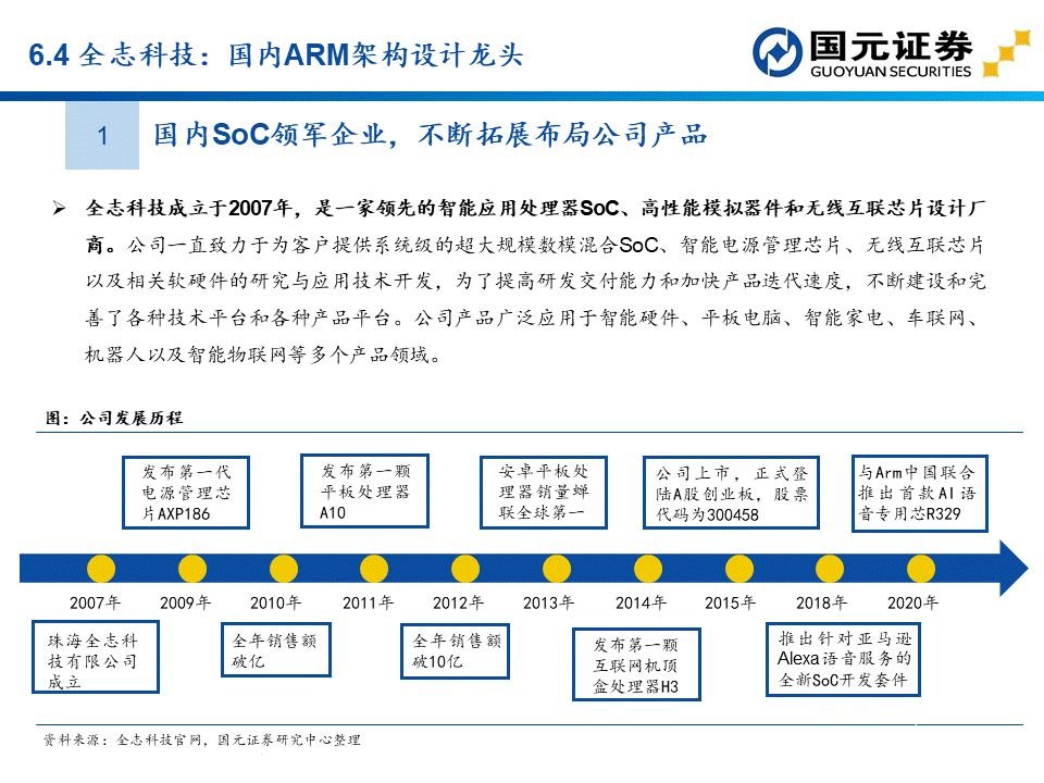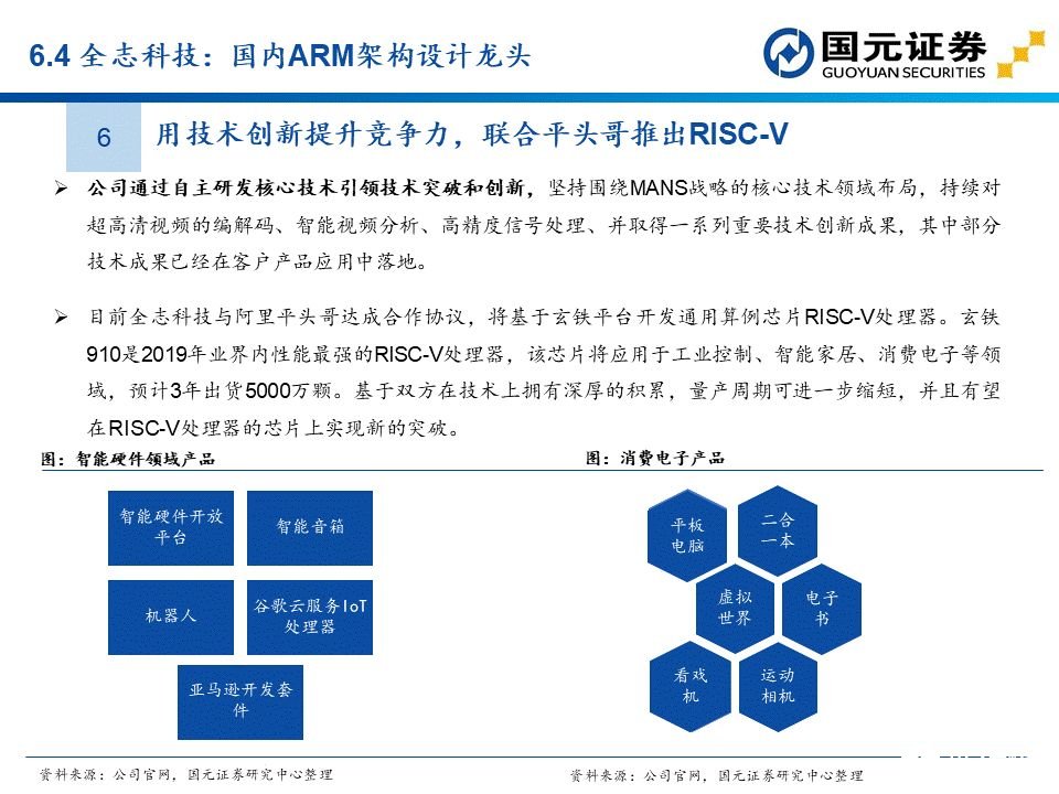 全志科技:国内领先的应用处理器厂商、ARM架构设计龙头,产品覆盖智能终端、智能车载、OTT无线通信等领域,打造多元化平台。公司已与平头哥达成战略合作,共同布局RISC-V架构生态,随着AIoT技术渗透以及国产替代进程加速,公司业绩将持续增长。