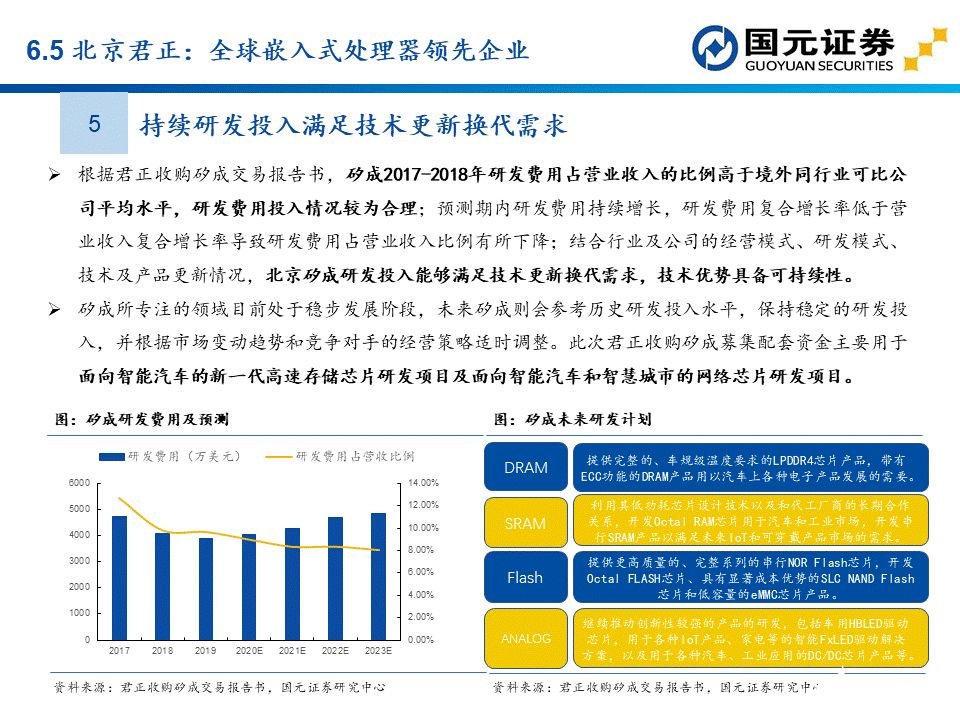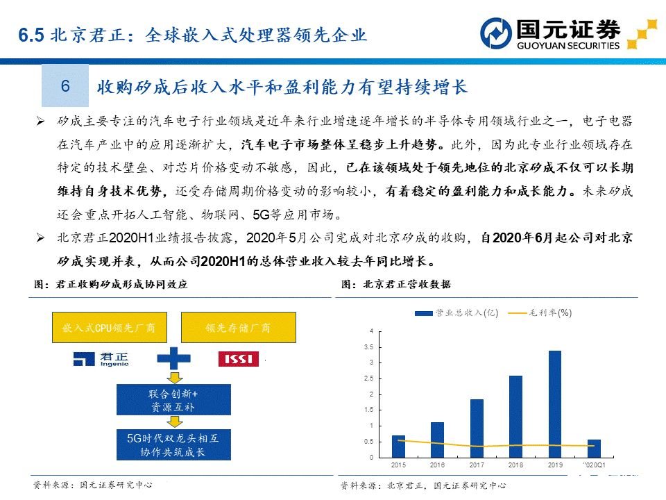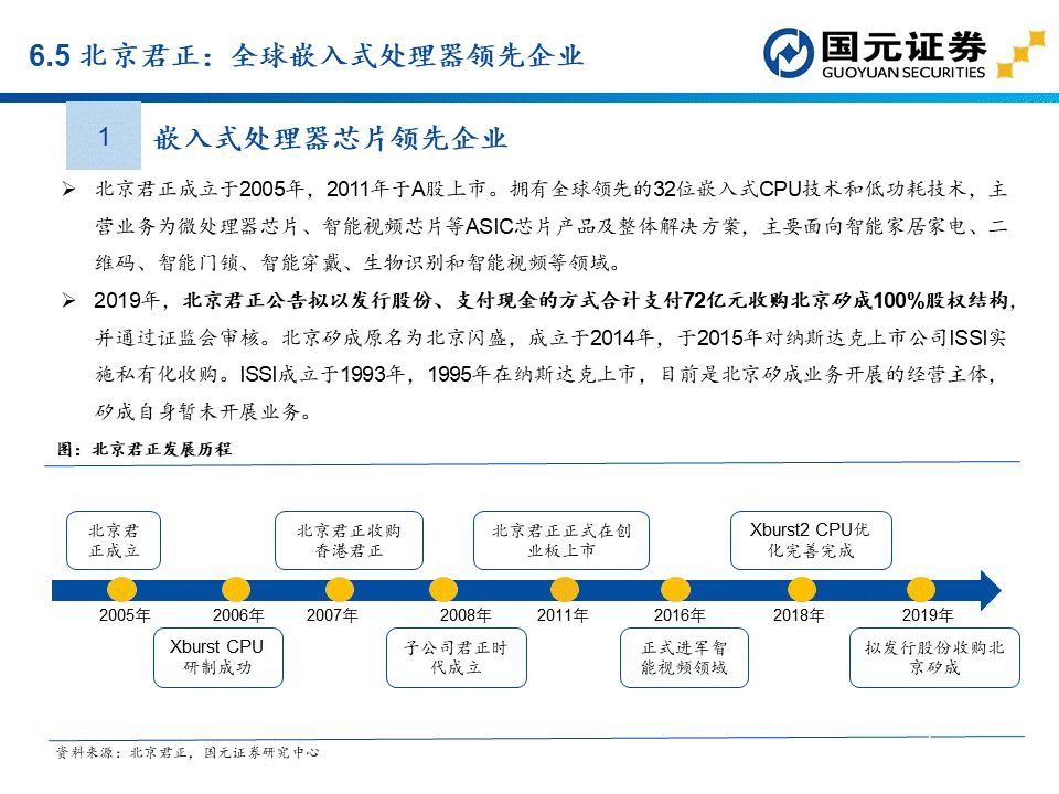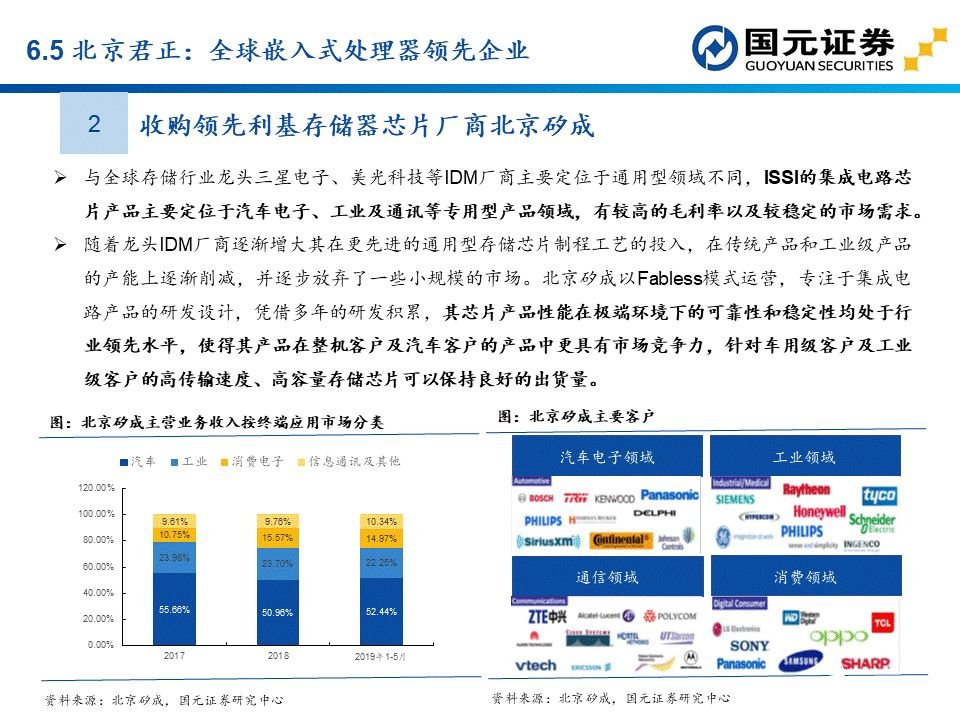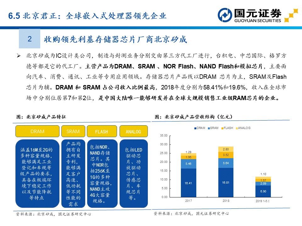 北京君正:公司拥有全球领先的32位嵌入式处理器技术和低功耗技术,产品线主要包括微处理器芯片、智能视频芯片等,此外公司通过收购北京矽成布局进军存储行业,SRAM全球第二、DRAM全球第7。